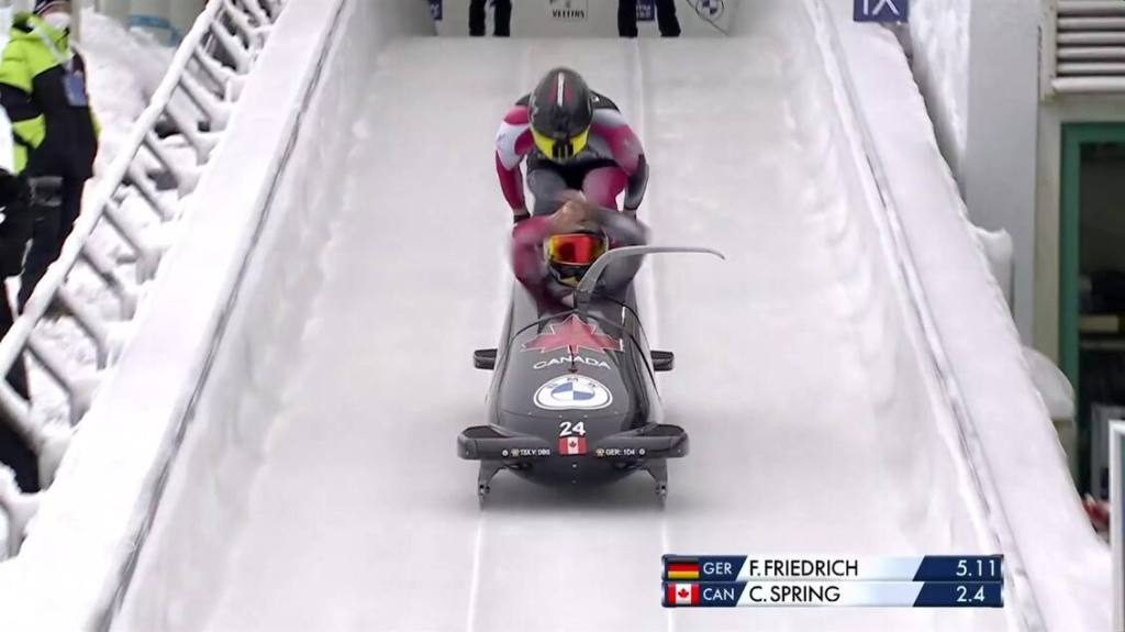 Storey said a successful bobsleigh team needs to quickly and forcefully push the sled off the starting block to get it going. Once they’re in the sled, that momentum is the only force pushing the sled down the track, along with gravity.